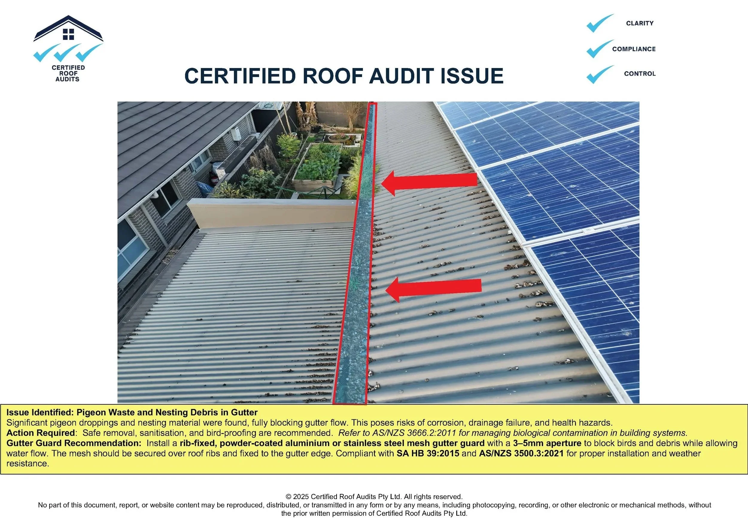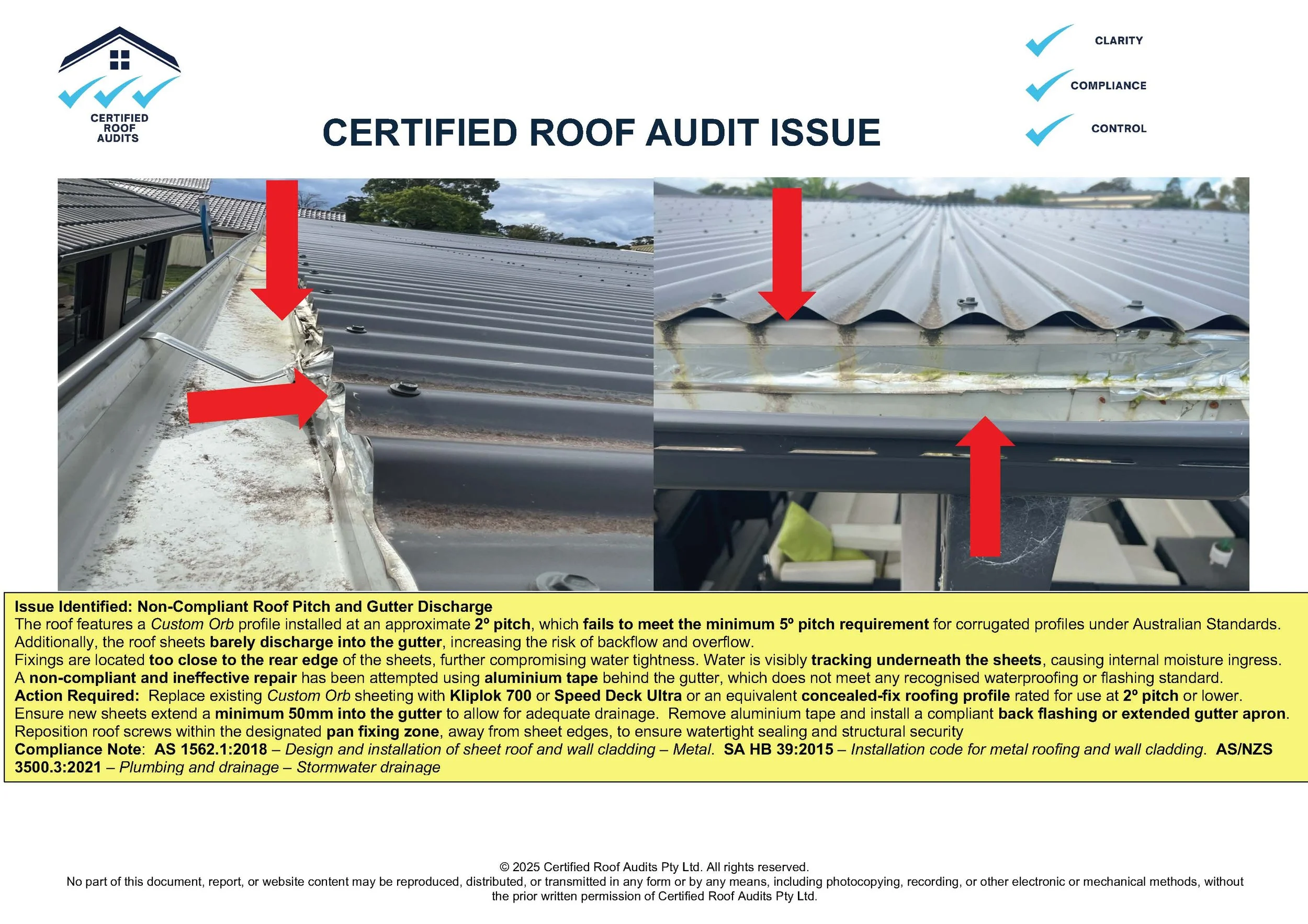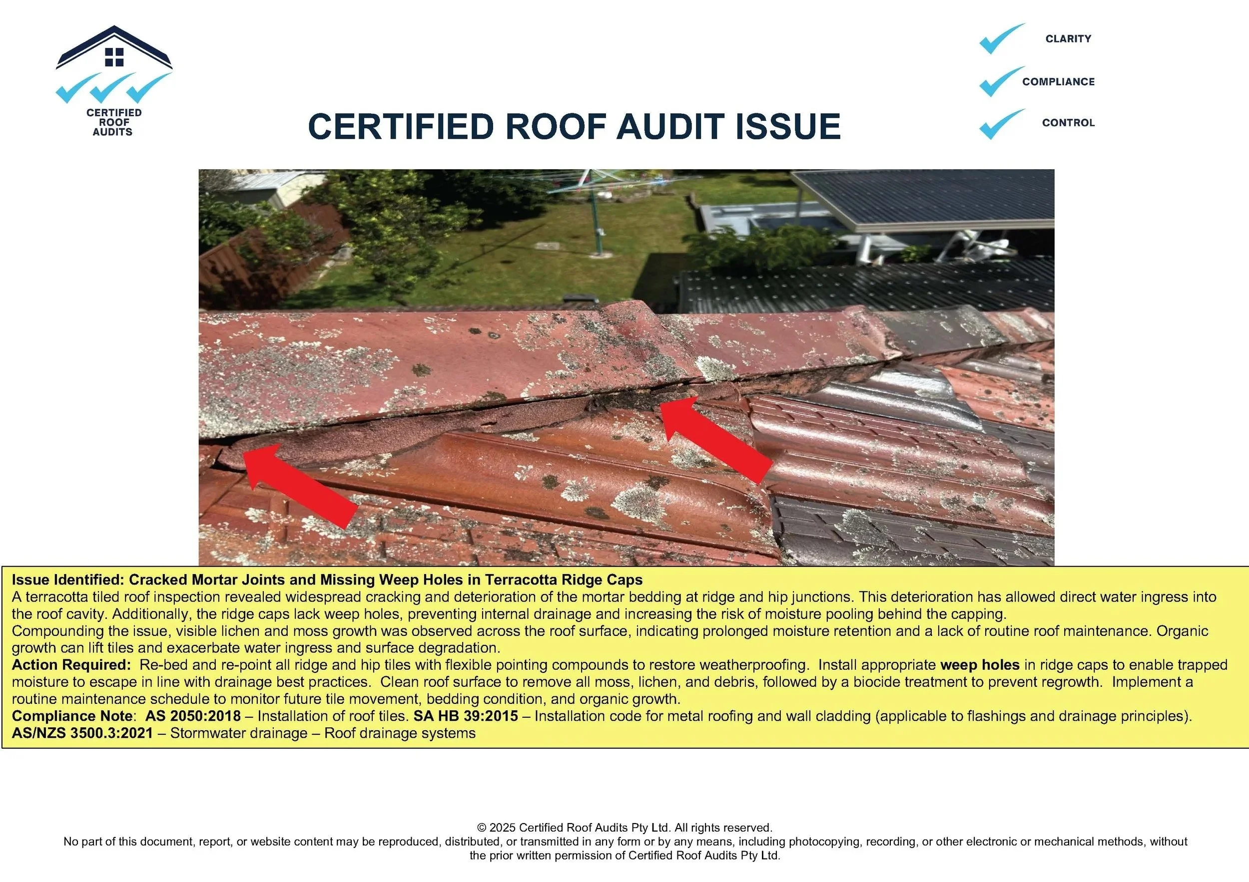 We ensure compliance with Australian Standards and building codes by inspecting roof materials (tiles or sheet), flashings, gutters, drainage, and penetrations. Each audit includes photographic evidence, condition grading, and clear recommendations aligned with current regulations — helping you avoid insurance claim rejections and unexpected repair costs.